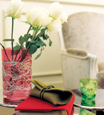 玫紅色的玻璃花瓶上金屬絲錯落盤繞,將白玫瑰映襯得格外浪漫,綠色印花水杯更顯得清新可人,紅與綠搭配出動人的和諧。