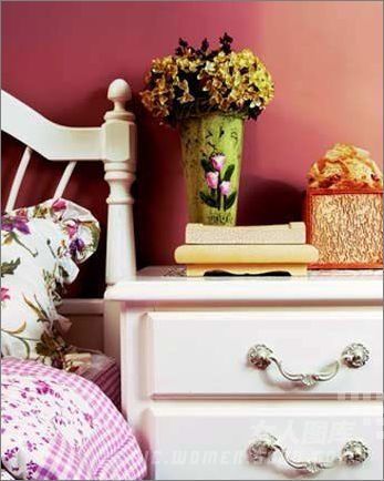 深褐色繪花箱式床頭柜搭配乳白色床架,在色彩上形成鮮明對比,猶如詩歌中的韻律,起伏跌宕,反而比白色更出彩,碎花床品銜接了兩者的色彩關(guān)系,更突出了整體和諧度。