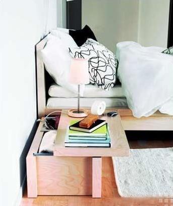 為你的床頭配置一個具有良好收納功能的床頭柜,像這個滑蓋的床頭柜就很棒,可以把有礙觀瞻的雜物收得一干二凈,而且隨用隨取,十分方便。