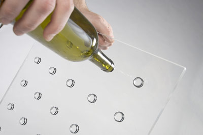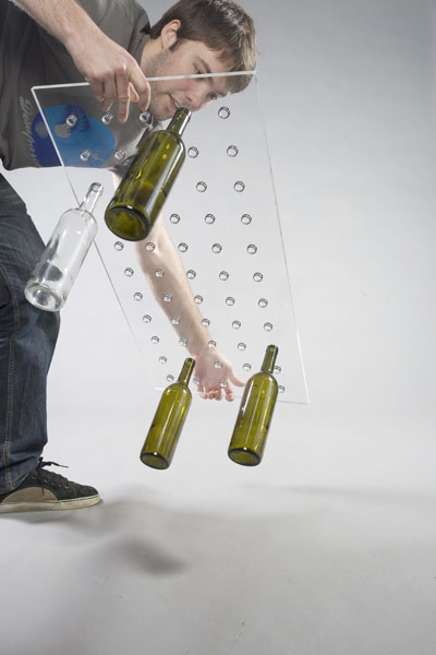 這款茶幾設(shè)計極其簡潔,上面的茶幾板用一種透明硬塑料制作,透明板下面圓圈是突起部分,而作為桌腳的玻璃瓶就插在四角的圈內(nèi)起到固定作用。