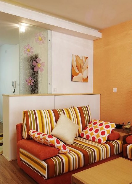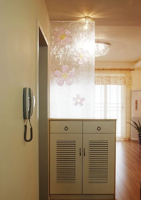 鞋柜上的花瓣屏風(fēng),用的肌理精雕玻璃客廳,在方正中利用柔美的色彩過(guò)渡,只想活躍你的思想。