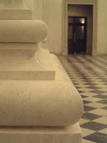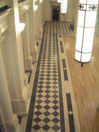 這座名列第二的銀行辦公大廳位于英格蘭銀行的正對(duì)面。整個(gè)工程都委托于Putney & Wood公司,工程主要運(yùn)用大理石來(lái)裝飾。大廳的外墻以及格板地面的裝飾均采用采自Sicily的新型大理石。該工程整體風(fēng)格復(fù)古,頗具歷史厚重感。