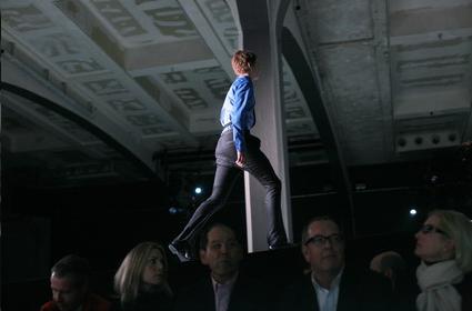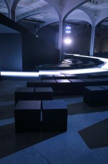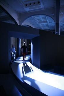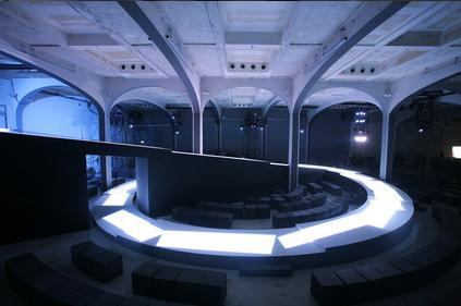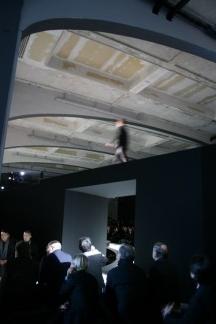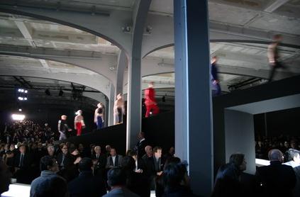 PRADA 2008秋冬男裝發(fā)布會(huì)會(huì)場(chǎng)的主導(dǎo)幾何元素依然是方形。不同的是,這次模特們不再走在道路交錯(cuò)的花叢中,而是走在雪域高山之上。秋冬發(fā)布會(huì)的會(huì)場(chǎng)采用藍(lán)、白作為主色調(diào),更能體現(xiàn)出男性的俊冷和硬朗。