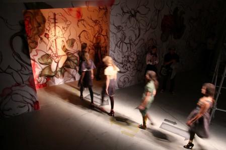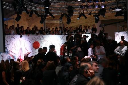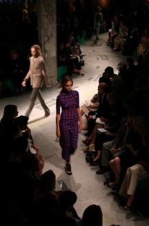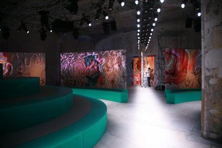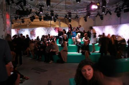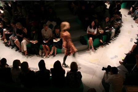 PRADA 2008春夏女裝發(fā)布會(huì)會(huì)場(chǎng)以“圓”為主設(shè)計(jì)元素,凸現(xiàn)出女性的“柔”。全綠色的布置加上中心部位擺放了三個(gè)小島,讓會(huì)場(chǎng)的整體布局像一朵盛放的花。PRADA的女孩子們就像精靈一樣在花叢中穿梭,展示著她們的美態(tài)!