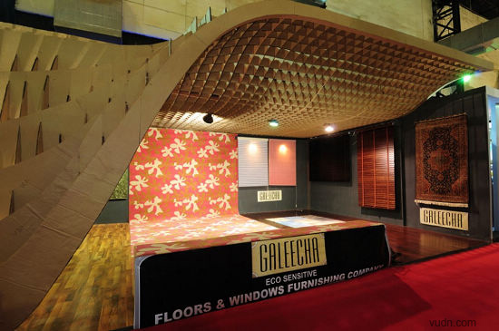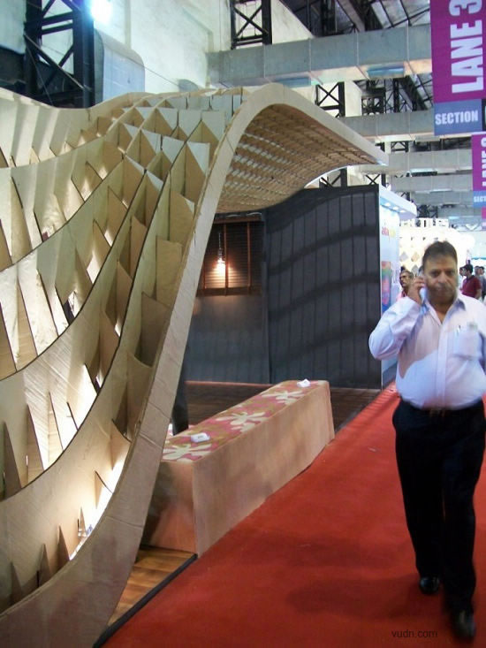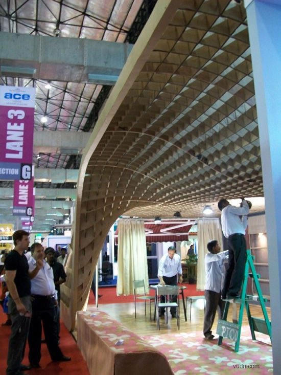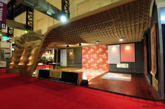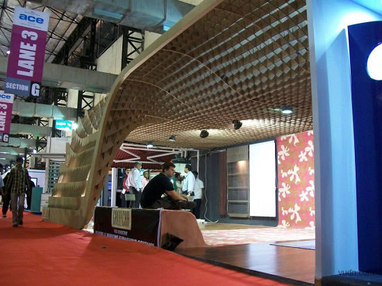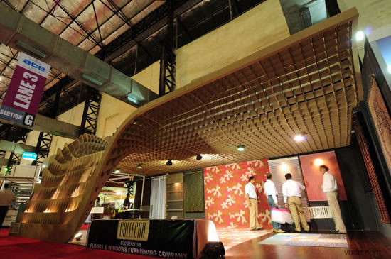 這個(gè)位于印度孟買(mǎi)的為ACE建筑展準(zhǔn)備的臨時(shí)展廳,是根據(jù)參數(shù)化軟件原理而設(shè)計(jì)。該臨時(shí)展廳長(zhǎng)20*6米,由110個(gè)工業(yè)模具和激光切片紙板制作而成。參展過(guò)后,制作的模板和紙板參展商會(huì)循環(huán)利用。