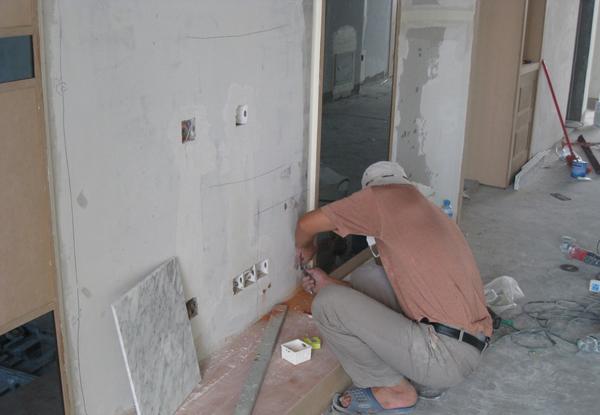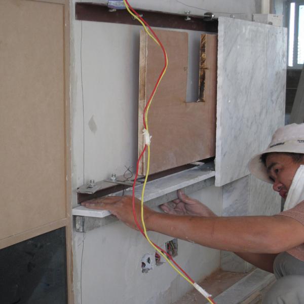 1.由于此案中背景墻面積較大,又凸出墻面10公分,為了安全起見,項目經(jīng)理建議我們采用干掛形式,也就是在墻面上焊鋼架,通過鋼架上的固定件和大理石塊相連接。這是安裝工人在墻面上劃線定位,安裝固定件。[page]