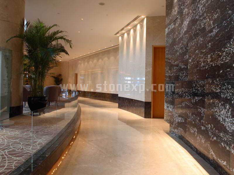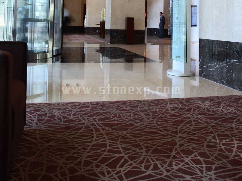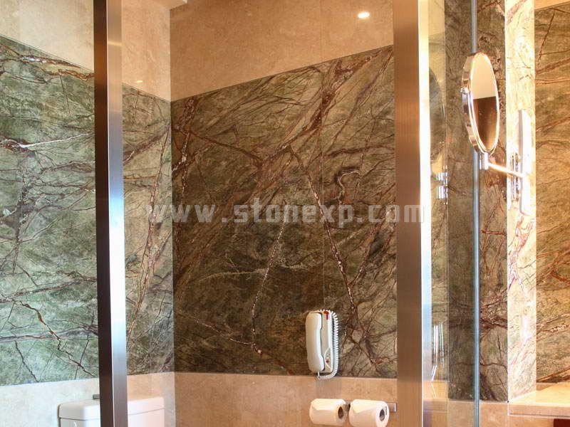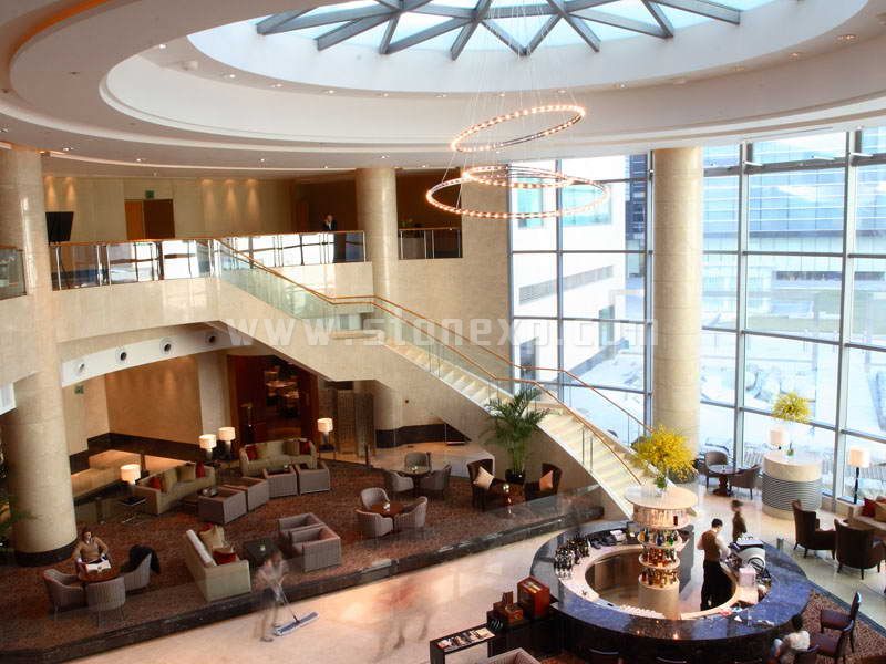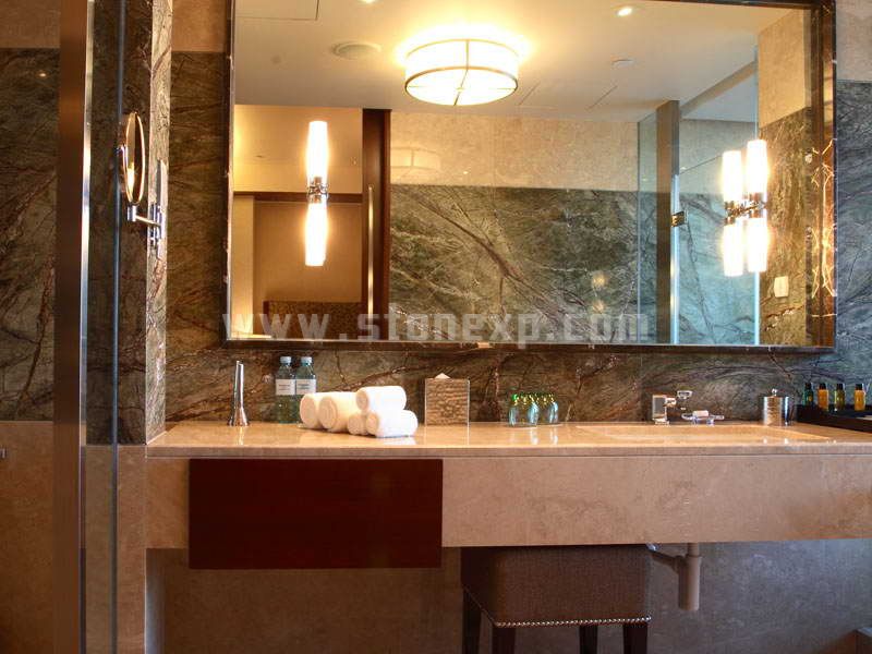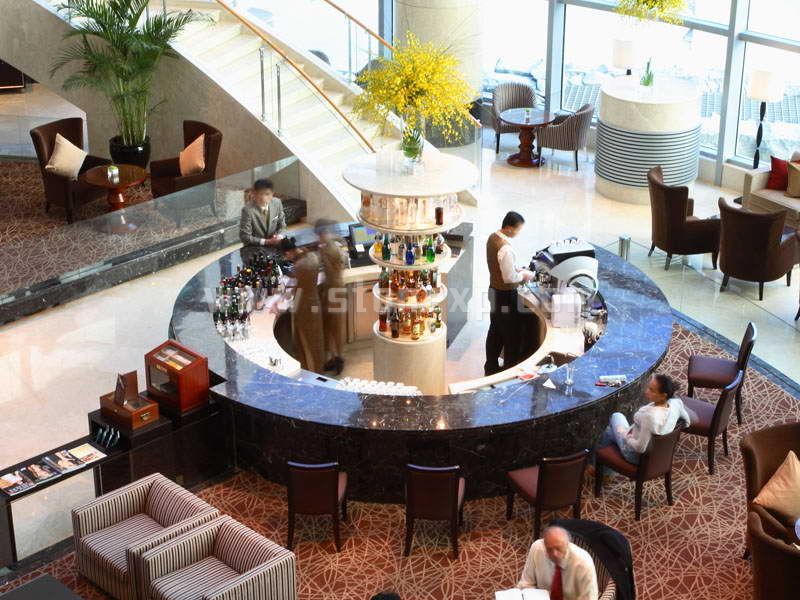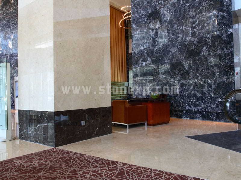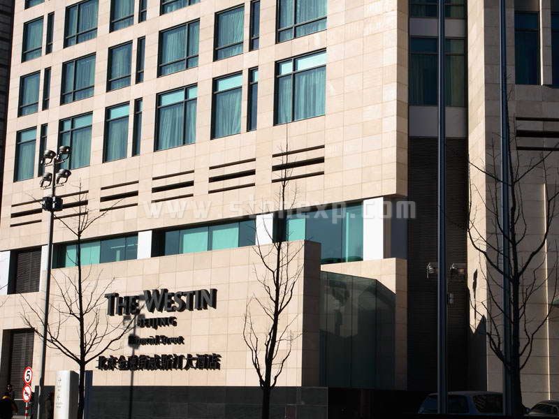 北京威斯汀酒店是一座五星級的酒店工程,其外墻及內(nèi)裝修都用了大量的石材,石材應用的場景及形式豐富多彩,如果天然黑色石材打造的圓形吧臺,雨林綠的背景墻,精美的石材拼花等等。