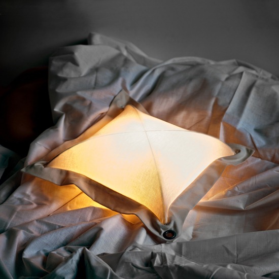 一盞有著柔軟質(zhì)感和溫暖視感的燈,織物表面材質(zhì)就如一只真正的枕頭一般柔軟光滑,可以掛在墻上做壁燈,扔在地上做地?zé)?,吊在頂上做吊燈,放在床上做床燈。外層織物可以輕松拆下洗滌,很獨(dú)特的感覺。