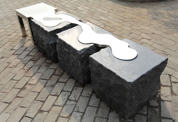 石頭與不銹鋼作為戶外家具的常用材料,有著持久,耐磨等優(yōu)點,且觀感上一輕一重,一剛一柔,也正適合表達(dá)聯(lián)系的概念:不銹鋼如流水般輕輕漫過石面,將其作為椅子的概念傳達(dá)給三塊石頭。石材在制作時保留了其自然面,這樣就在人工雕飾過的椅子上保留了一份自然地氣息,讓椅子可以適應(yīng)更多的擺放環(huán)境,在規(guī)矩中顯露一絲調(diào)皮,在自然中透射一份嚴(yán)謹(jǐn)。
