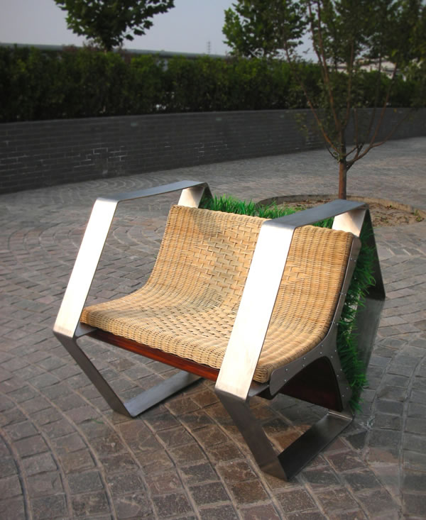 這是一個可以給人帶來不同感受的作品,有新奇,有趣味。使用者通過與作品的互動來實現(xiàn)不同的感覺,在座椅的材料上分別采用原木、藤編、仿造草皮,賦予變化的材料,也是對戶外座椅的新探索,這種可變化性也許正是戶外環(huán)境的新體驗。