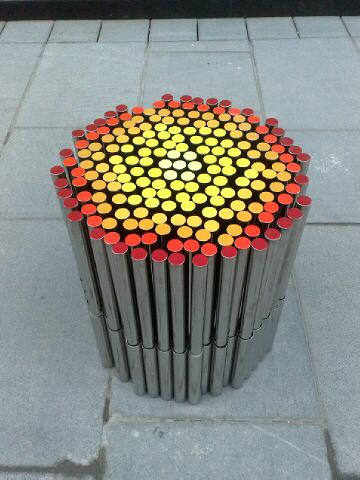 靈感來源于小時候常玩的頂板游戲,在此基礎(chǔ)上做的聯(lián)想在每根小柱子下都加了彈簧。墩子頂視為圓形在你坐下的時候由你本身的重力施壓下降,沒有做到的地方自然成為靠背和扶手,當(dāng)你站起來,椅子又恢復(fù)原樣。釘子的頭是不銹鋼的小圓球,也可套上特定大小的海面泡沫球,增加柔軟度,緩和金屬冰涼的感覺。實用性與趣味性并存。