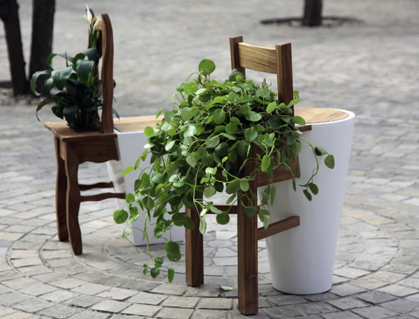 此款室外座椅的靈感來源于我對人與自然關(guān)系的感受。人類與自然界的動物、植物共同生存在地球之上,相互依靠,是平等的生命。在這里,我用擬人的手法讓人與植物交換座位,來表達(dá)我的感受。椅子被變形作為花盆,而花盆則成為人的座椅?;ㄅ枭系哪旧w可以掀開,里面可以放置包包等隨身物品。這款椅子適用于公園、廣場、戶外餐飲等室外環(huán)境,幽默,美觀。