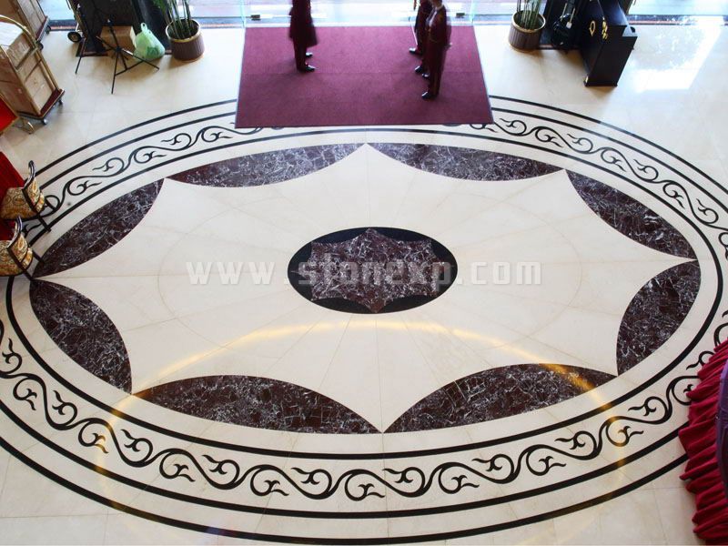東莞虎門(mén)富萊酒店工程最具特色的是其石材水刀拼花,其加工工藝難度極其高,及拼花的設(shè)計(jì)極富藝術(shù)性,傳達(dá)酒店獨(dú)有的品味與魅力。主要石材用料是:西班牙米黃、黃金米黃、白宮米黃、啡珍珠、金鉆麻、皇室啡,西施紅。