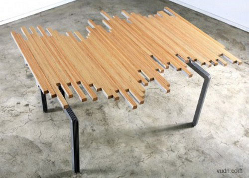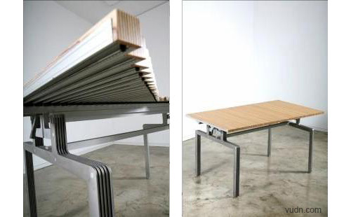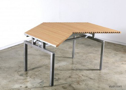與普通的桌子不同,這款可滑動(dòng)的桌子是由50跟木條組成的桌面,下面的支架可以左右移動(dòng),并且一起帶動(dòng)上面的一部分木條移動(dòng),最終將一張長(zhǎng)方體的桌子,變成一張菱形的桌子。這樣設(shè)計(jì)的好處是:可以讓桌子適應(yīng)更多的空間。