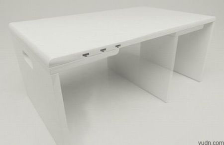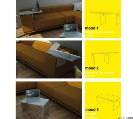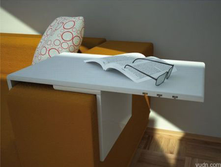 考慮到現(xiàn)代住宅對家具提出的緊湊和實用要求,意大利設計師Alessio Monzani推出了這款可調節(jié)夾板桌。這款桌子的兩個桌腿可以調節(jié)距離遠近,能夠方便地固定在沙發(fā)扶手上,或者直接當作小方桌使用。