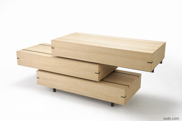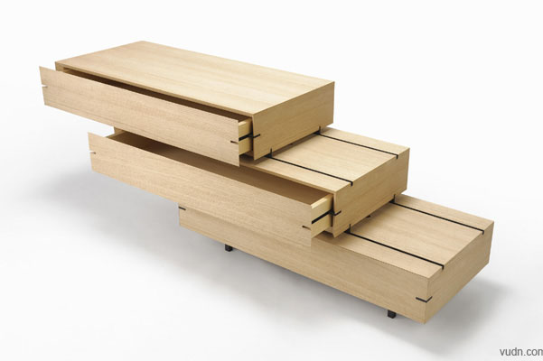 常見的家具中有一種叫“五斗柜”,是由五個疊放在一起的大抽屜組成的。這里介紹的這款設(shè)計,是把這些抽屜增添一個可以滑動的小功能,就是在每個抽屜之間安裝滑道和滾輪,這樣它們就可以很輕松的變換造型,或許您可以在這些抽屜滑動后的上面放一些小物品,或許您可以認(rèn)為滑動后的抽屜,利于拿取里面的物品。
