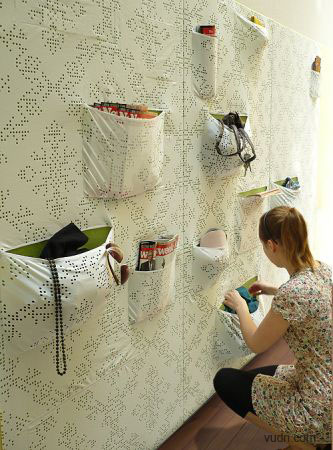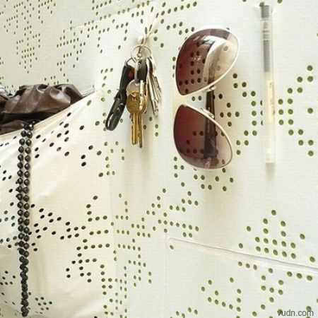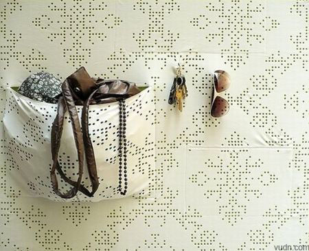 這不是普通的墻紙,它具有彈性,并且有些奇特的部位。嚴格來說,這款密密麻麻布滿點狀花紋的墻紙不能算是墻紙,而應(yīng)該稱為墻衣。我們可以將小物件通過墻衣小孔掛在墻上,還能將報紙雜志放到墻衣的大口袋里,充分利用了空間。
