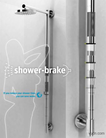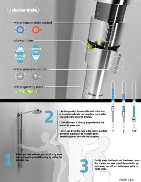 這是一款新型淋浴噴頭。淋浴的控制設(shè)備全部集中在淋浴水管上,從上到下,各個(gè)旋鈕分別控制水溫、淋浴時(shí)間、水壓,管道上還有水量標(biāo)識(shí)。在淋浴之前,您需要估計(jì)自己所用水量,根據(jù)水量標(biāo)識(shí),將控制器移至相應(yīng)位置。淋浴器期間,控制器會(huì)勻速下滑,您可以根據(jù)它與下滑下限之間的距離來(lái)估計(jì)剩余水量,從而調(diào)整水壓。當(dāng)控制器滑到初始位置的時(shí)候,您需要將控制器重新提拉上去方能繼續(xù)淋浴。因?yàn)檫@款淋浴噴頭的控制器提拉上限為建議淋浴水量,所以,如果您需要重復(fù)提拉幾次才能結(jié)束沐浴,就應(yīng)該思考一下自己的用水模式節(jié)約用水了。