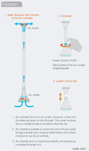 1.基本結(jié)構(gòu)和功能(上為噴氣口,下為進(jìn)氣口):通過空氣從進(jìn)氣口進(jìn)入而后從噴氣口噴出,空氣傘為使用者提供一道氣幕。這道氣幕能夠起到傘蓋的作用,用來阻擋雨水。