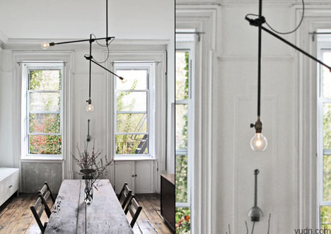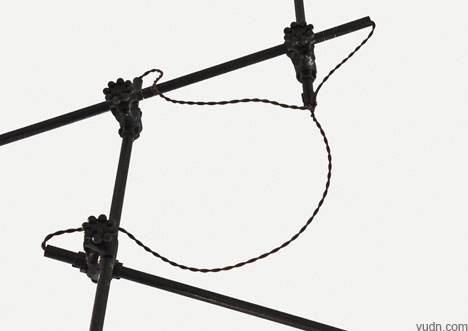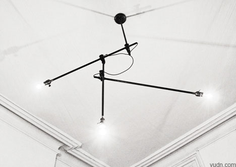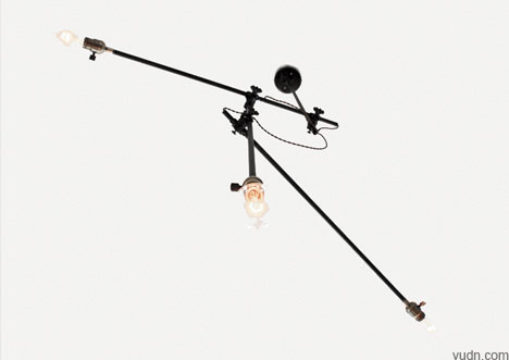 雖說造型簡單,甚至于有些簡陋,但習(xí)慣擺弄攝像器材的朋友們應(yīng)該不會對這款吊燈的支架造型感到陌生吧?設(shè)計師采用了常用于可調(diào)節(jié)器材上的調(diào)節(jié)旋鈕支架作為燈泡的支撐,讓吊燈的擺放更加自由。
