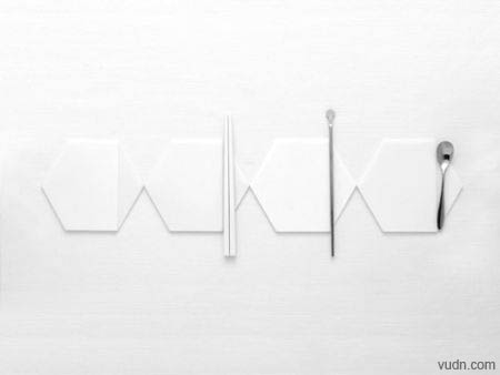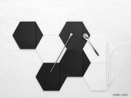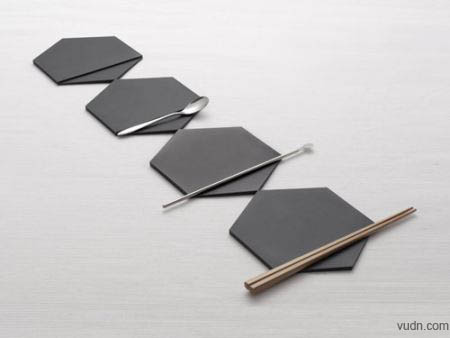 這是一款由設(shè)計(jì)師Kitmen Keung設(shè)計(jì)的餐墊。它的外形是六邊形,使用時可以根據(jù)主人的意愿,或折疊或拼湊擺放。表面還有凹凸設(shè)計(jì),可以穩(wěn)固放置餐具。整套設(shè)計(jì)干凈利落,風(fēng)格簡約。