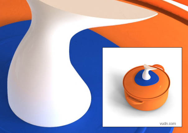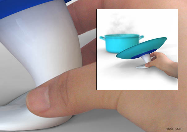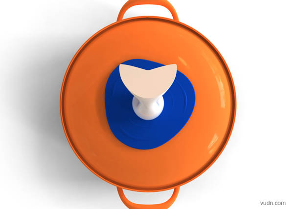 這里要說的是壺蓋兒,它是為烹飪而制的。頂部有一個海豚尾巴,你也可以認為它是其它的你想象到的動物尾部,但設(shè)計者Sangyoon Kim說是海豚的尾部。在尾部的下面有類似海洋的硅膠墊子,它是用來隔熱的,可以使你不碰到滾熱的壺身。