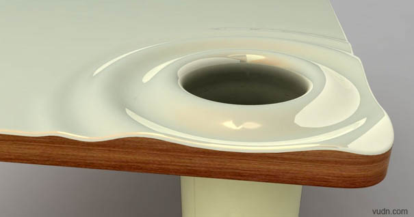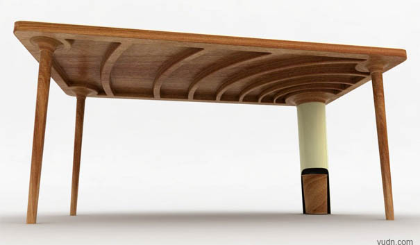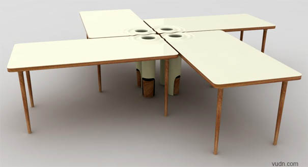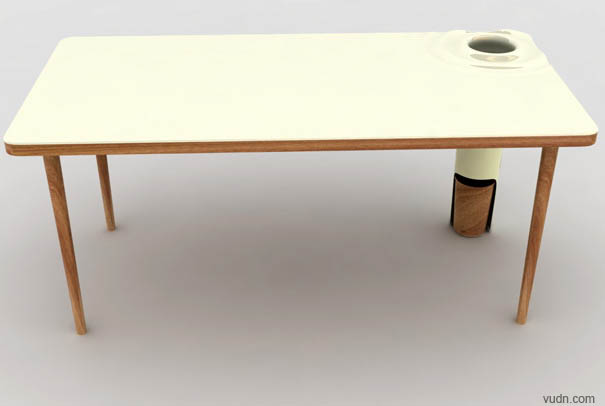 這里所說的垃圾桌子有一條空心的桌腿,在桌腿的底部有一個垃圾桶,不用擔心,入口部分具有波紋設計,可以避免其它有用的東西滾入桶中。這張桌子是由再生木材制成,頂部是由竹子填充的聚合物制成。妙極了,你不想擁有一個嗎?
