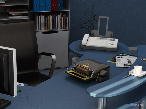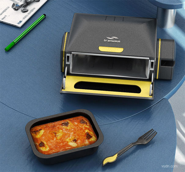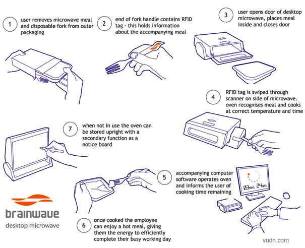這是一個(gè)桌面微波爐,專為那些工作狂和書(shū)呆子設(shè)計(jì),似乎誰(shuí)也無(wú)法讓這些人離開(kāi)計(jì)算機(jī)。該微波爐可通過(guò)USB接口與電源端口連接,通過(guò)控制計(jì)算機(jī)來(lái)應(yīng)用。一個(gè)帶有RFID標(biāo)簽的塑料勺子將帶有特殊包裝的食物和標(biāo)簽信息經(jīng)掃描傳送到微波爐,然后反過(guò)來(lái)又自動(dòng)設(shè)定加熱時(shí)間。這樣就可以吃到熱騰騰的食物了。