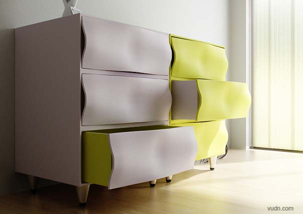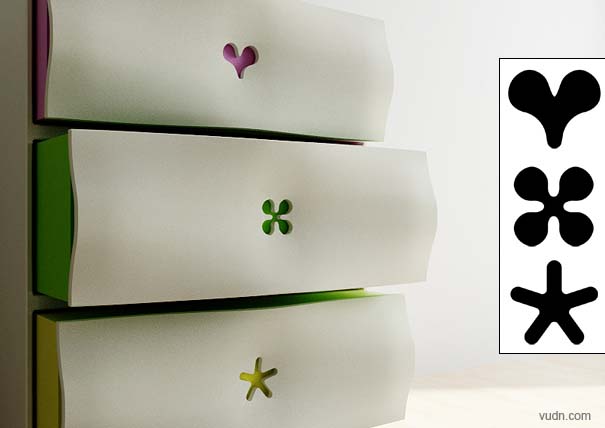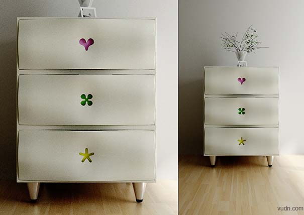 現(xiàn)在的生活越來越單調(diào),而現(xiàn)在的新產(chǎn)品卻不是乏味。就連抽屜的形狀也可以是波浪形的,心型、四葉草、六角形的標志點綴下,越具現(xiàn)代色彩。容器的容量與框架的適度,即不占位置,也不失抽屜容量空間之大。一共有三個柜子,上下重疊,界限分明。五彩繽紛的色彩,