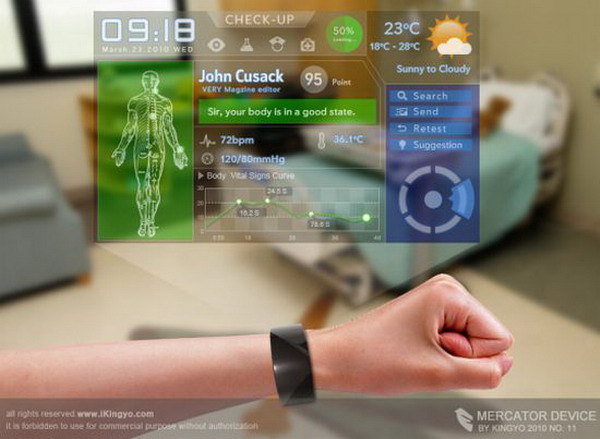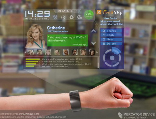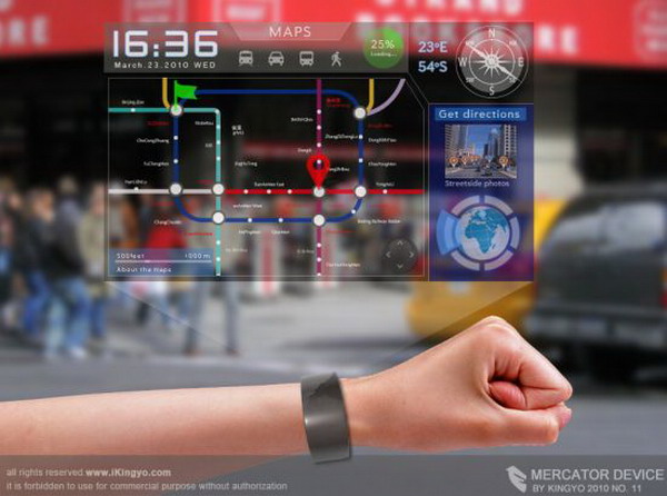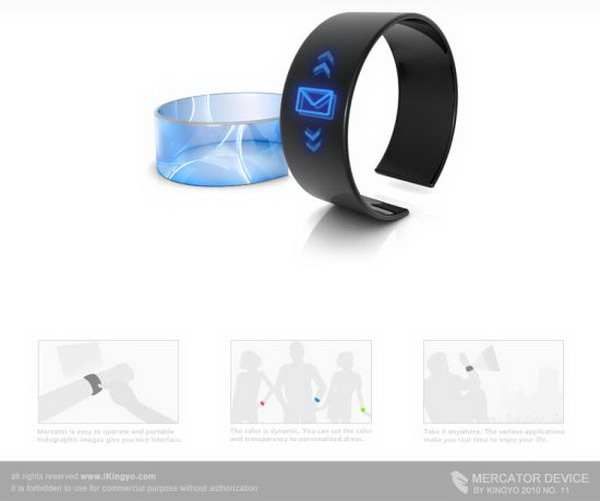 在這個(gè)經(jīng)濟(jì)快速發(fā)展的時(shí)代,人們幾乎沒(méi)有時(shí)間來(lái)進(jìn)行更多的個(gè)人娛樂(lè)。針對(duì)這種情況,中國(guó)成都的設(shè)計(jì)師Kingyo推出了一種新產(chǎn)品—Mercator時(shí)尚配飾。這是一個(gè)通過(guò)全息成像和納米技術(shù)來(lái)幫助人們管理他們的日常需要的新產(chǎn)品。用戶(hù)通過(guò)它可以進(jìn)行購(gòu)物、導(dǎo)航和更多的日常性工作。而其還會(huì)改變顏色,顯示出彎曲的設(shè)計(jì),同時(shí)增強(qiáng)了用戶(hù)的個(gè)性。