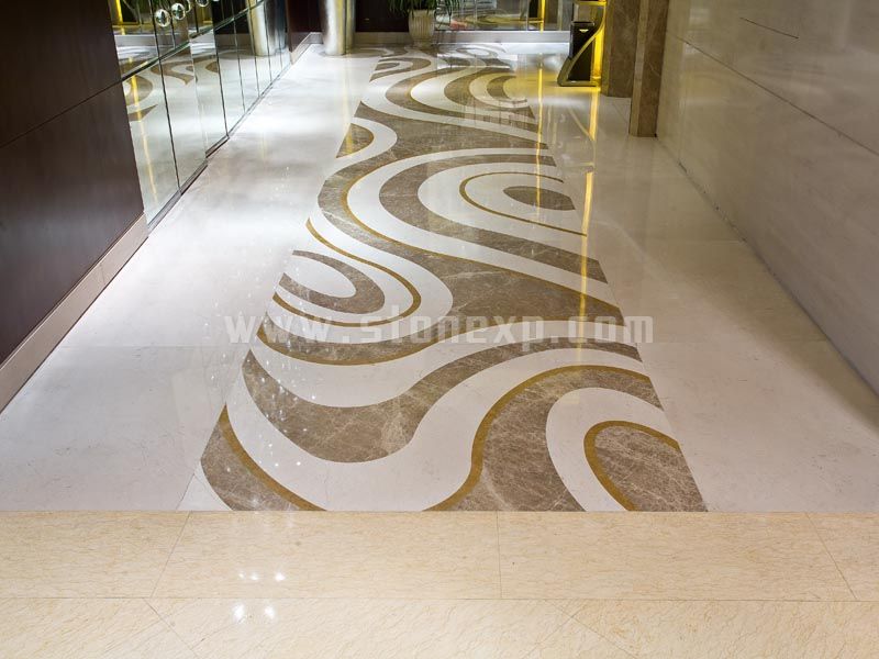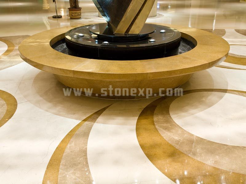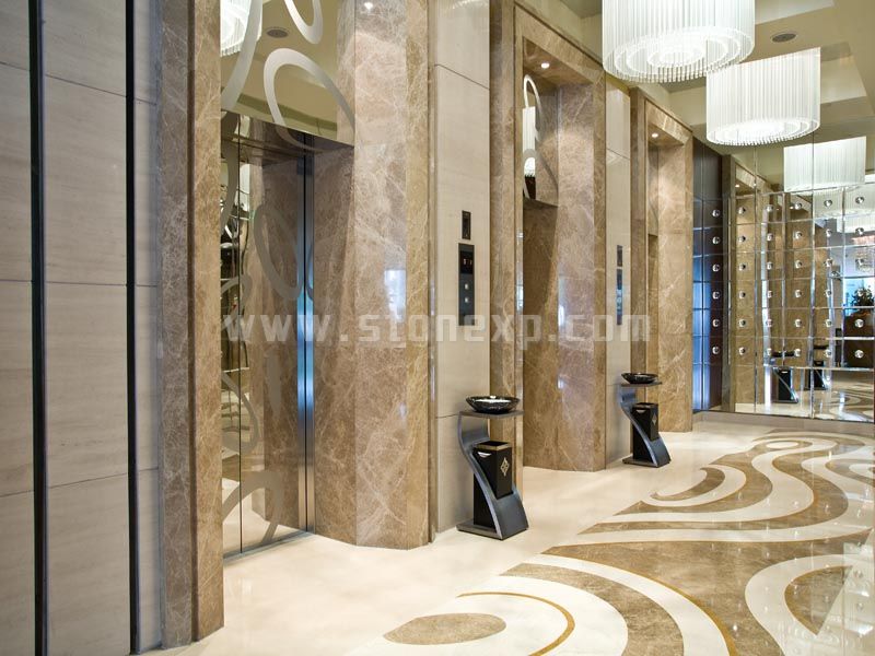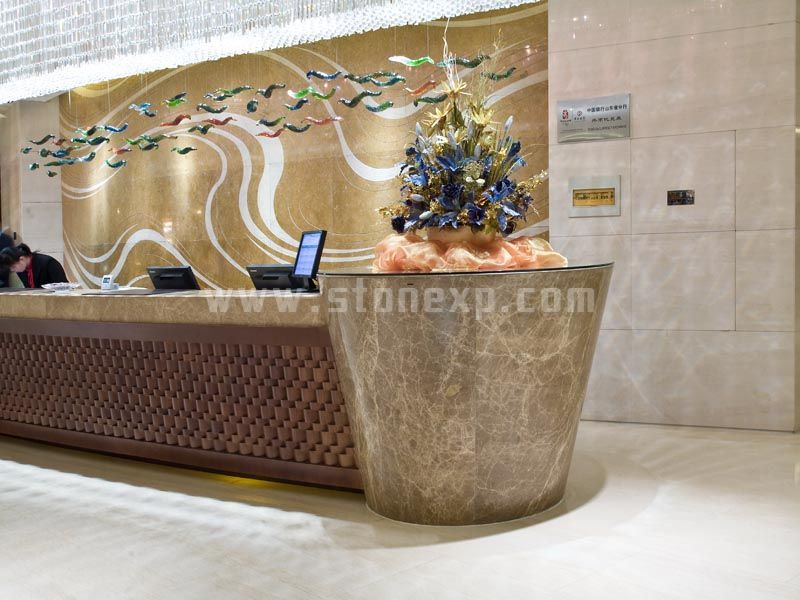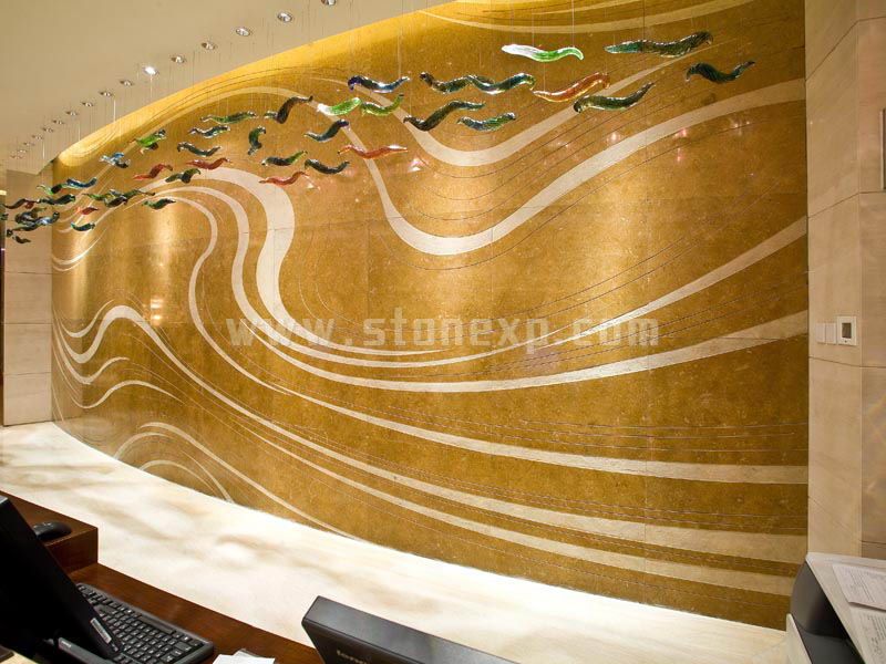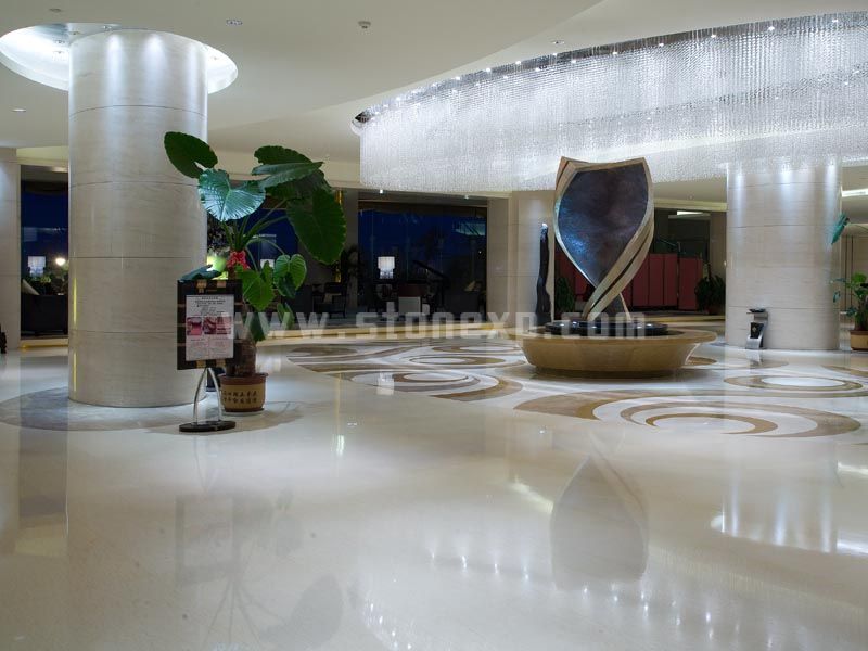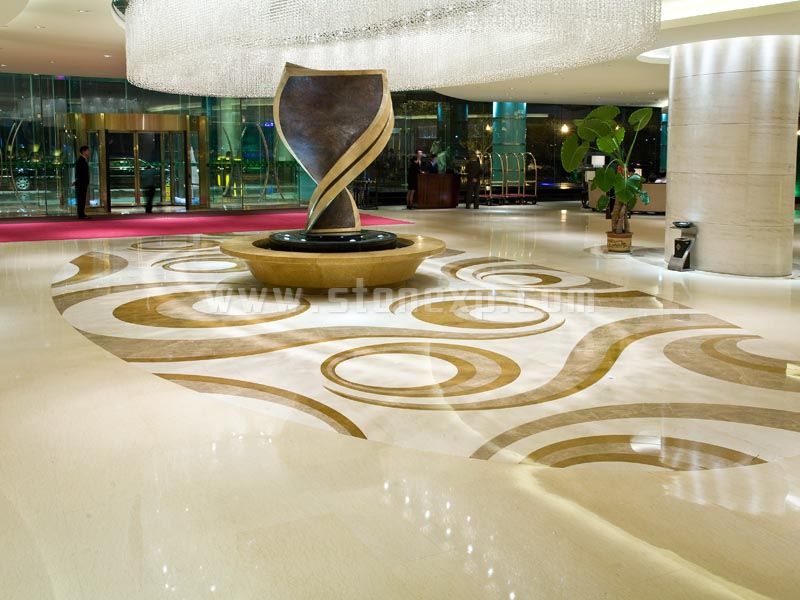 亮點(diǎn):旋轉(zhuǎn)樓梯,地面無縫拼花 、大堂背景墻拼花。