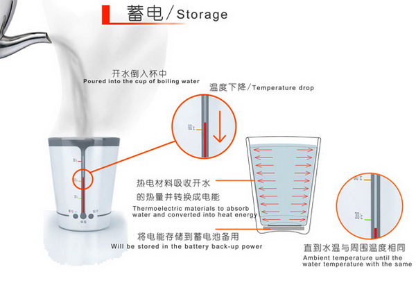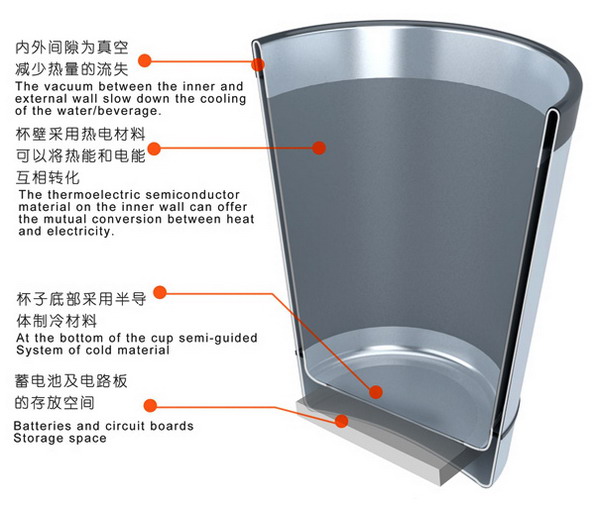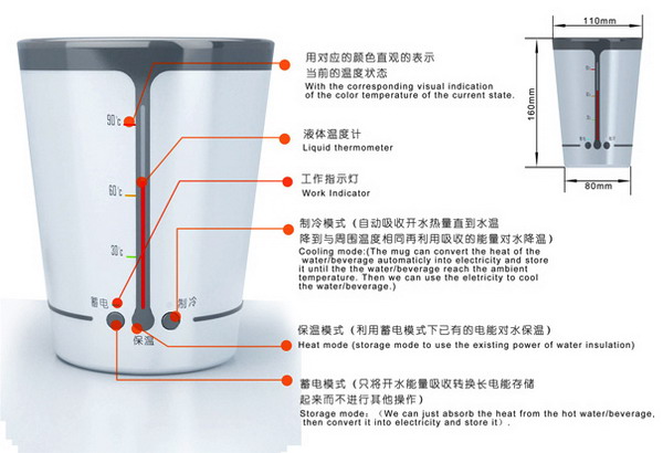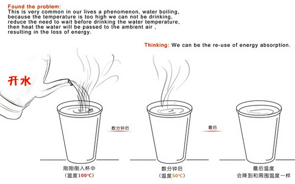 水從冷到熱是吸收了外部的熱量,再?gòu)臒岬嚼涫窍蛲獠酷尫帕四芰?,這樣簡(jiǎn)單的道理大家都知道,但我們有沒(méi)有想過(guò)如何利用水從熱到冷散發(fā)出的熱能了?這里設(shè)計(jì)師Ruan Chengzhu設(shè)計(jì)的水杯可以利用起散發(fā)出的熱能,通過(guò)設(shè)計(jì),在杯子的底部設(shè)計(jì)有吸熱裝置,可以將水散發(fā)出來(lái)的熱能吸收轉(zhuǎn)化為電能,然后儲(chǔ)存起來(lái)備用。 在水杯的外形設(shè)計(jì)上,設(shè)計(jì)師也是盡量的做到盡善盡美,將杯子設(shè)計(jì)為雙層,內(nèi)外間隙為真空可以減少熱量的流失。