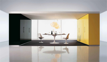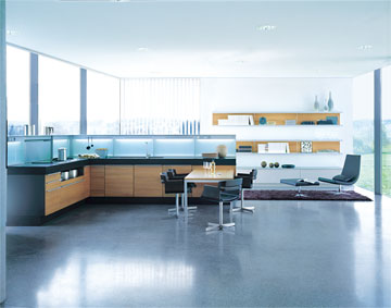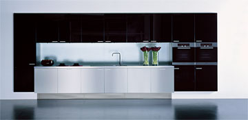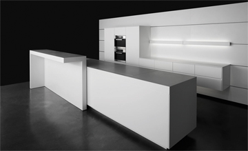 The +Integration kitchen concept shows an innovative front design and integrates new design features. Unusual proportions and high-grade materials define contemporary luxury in a new individual way. Massive fronts, homogeneous in colour, made of Parapan in brilliant black, brilliant grey or brilliant white, contrast with expressive exotic wood veneers such as Swiss pear, walnut or zebrano. Floor-to-ceiling components as tie between the supporting architecture and the room design allow an aesthetically aligned planning of the kitchen, independent of constructional circumstances. +Integration turns the so far mono-functional earmarked kitchen space into a communication centre of the house. Solitary pieces of furniture, aesthetically highlighting the multimedia elements, represent an expanded living room function. Elegant highboards, each integrating a complete home entertainment concept in itself, create new visual spaces. Another innovation is the Smart Home technology, offering new possibilities to network the kitchen intelligently. The entire home equipment can be centrally controlled with the +Integration system. At the same time, this system includes telephone communication and an Internet access. The operation via a discreetly designed touch panel is simple and self-explanatory.
