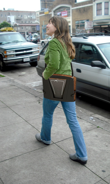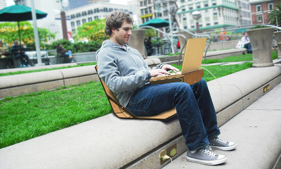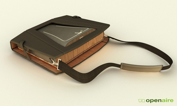 Openaire 是一個(gè)手提包形式的筆記本支架,外部可以成為椅子,內(nèi)部是筆記本的架子,當(dāng)然,它也是空心的,用來(lái)在里面放入筆記本電腦。在外面清新的空氣進(jìn)行工作、聊天的時(shí)候,這是很方便的形式。