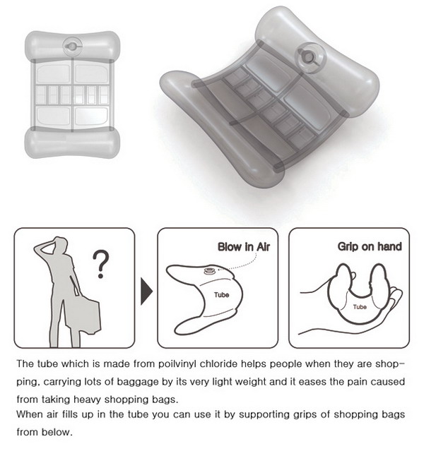 基本算是為男同胞所準(zhǔn)備,對(duì)于電影那種狀況來(lái)說(shuō),男的累死累活,提著一堆大包小包。我們都知道,購(gòu)物袋提的時(shí)間久了,或者太多,上面的繩子會(huì)勒的手疼,受力面積小的話,對(duì)于手也會(huì)很累,所以設(shè)計(jì)師創(chuàng)造了這款產(chǎn)品,可以幫助讓你提更長(zhǎng)的時(shí)間。它的體積很小,是氣囊的形式,將空氣放完后,可以放置在錢(qián)包中,比較便攜,需要用到的時(shí)候,吹氣就可以用了。