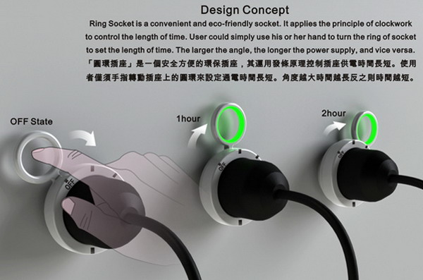 設(shè)計(jì)一小步,節(jié)能一大步。不要以為只有節(jié)能電燈哦,其實(shí)也有節(jié)能插座的。看看這個定時插座,它是一個非常安全的環(huán)保插座,其采用發(fā)條的原理來控制插座供電時間的長短,就好比一個附加在插座上的定時器。使用者需要用手指轉(zhuǎn)動插座上的圓環(huán)來設(shè)定通電時間的的長短,圓環(huán)角度的大小決定了供電時間長短,圓環(huán)上還配有LED燈,分別可以顯示待機(jī)、使用中以及關(guān)閉三個狀態(tài),而且亮起來的燈的顏色也不同!