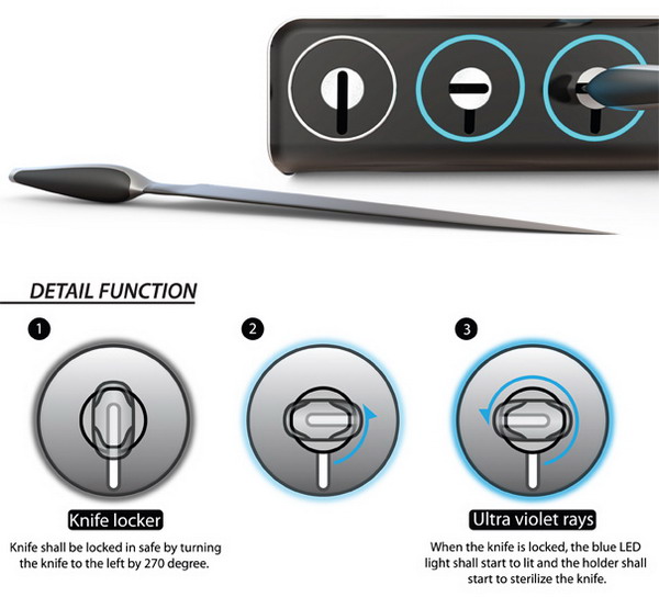 設(shè)計(jì)師Min Seong Kim的這款帶鎖的安全刀插 (Knife Locker),試圖解決這個(gè)問(wèn)題,在方便的基礎(chǔ)上兼顧安全:一般來(lái)說(shuō)刀把和刀寬,,都是刀把細(xì)而刀片寬——而這種寬度上的差異,在設(shè)計(jì)師看來(lái),就剛好可以成為一種很棒的鎖止機(jī)構(gòu)。也是結(jié)構(gòu)就很好理解了,將刀往刀插里面一插,順手一扭,刀片就會(huì)卡在刀插里面,讓這把刀不能簡(jiǎn)單地直接一拉就取出。當(dāng)然,這種結(jié)構(gòu)下,要取用刀具仍然很簡(jiǎn)單,握住刀把反方向旋轉(zhuǎn),刀片對(duì)準(zhǔn)出入口后,一拉就出來(lái)了。對(duì)你我大人而言,這個(gè)增加的動(dòng)作不會(huì)造成任何功能上的困擾。但是對(duì)小孩子而言,這個(gè)動(dòng)作也許就能避免他們意外受傷。