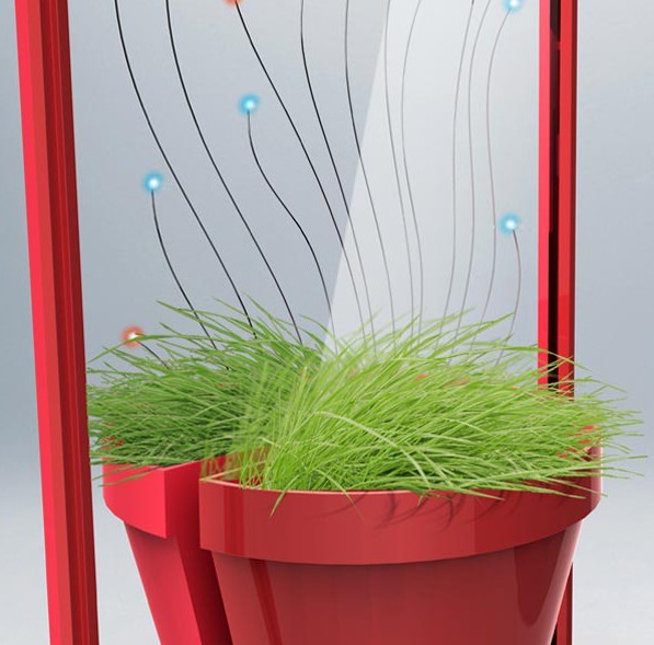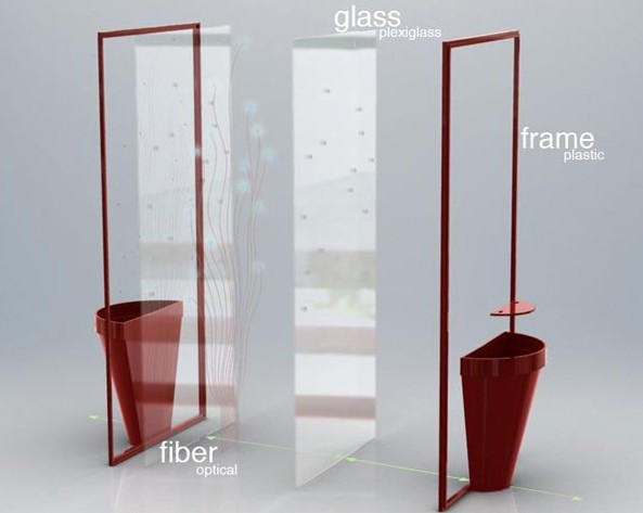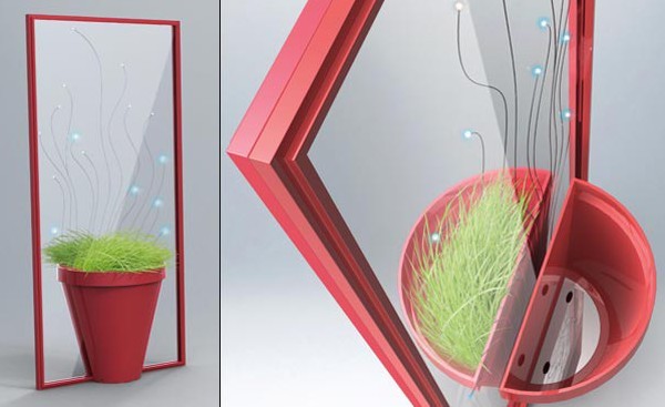 生活中的點點滴滴都可以注入環(huán)保的元素,例如我們每天早上起來對著的鏡子。Julien Bergignat,Mathieu Azema,Arthur Brault等多人設(shè)計了一款概念環(huán)保產(chǎn)品,這是一款可以擺放在家中的綠色鏡子,它由有機玻璃塑料框架以及光學(xué)纖維組合而成,并在鏡子的下方設(shè)計了花盆,可以在穿衣的同時感受到綠色帶來的好心情。虛擬的綠色盆栽在真實的世界里也顯得特別的生動。