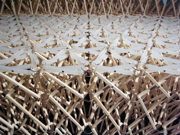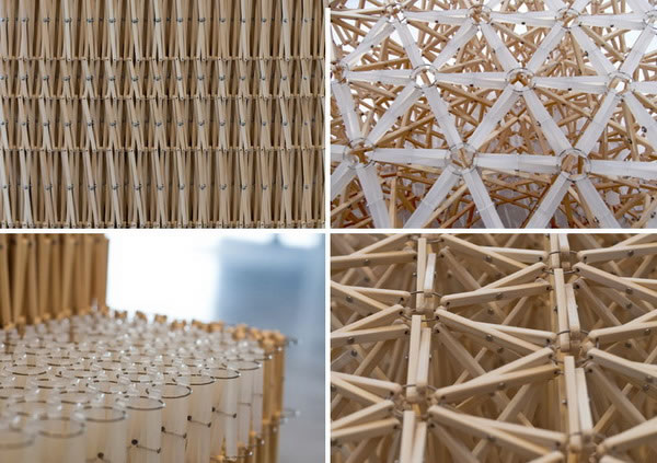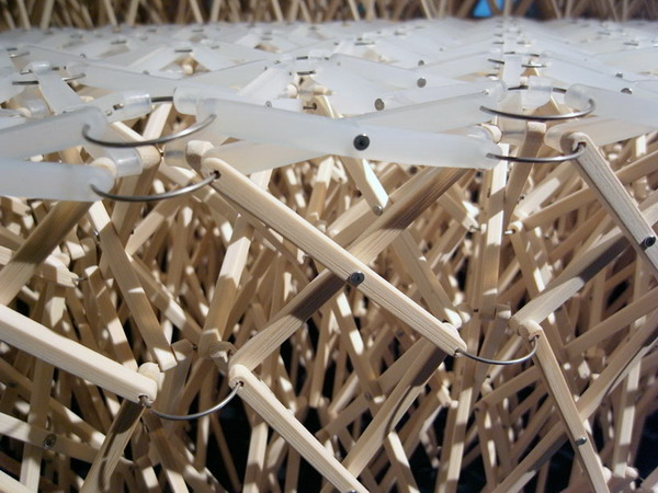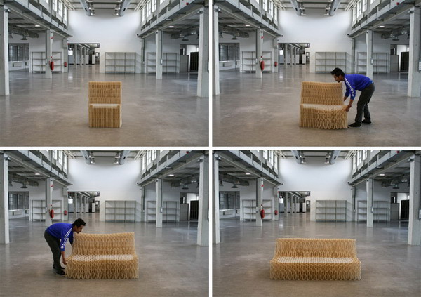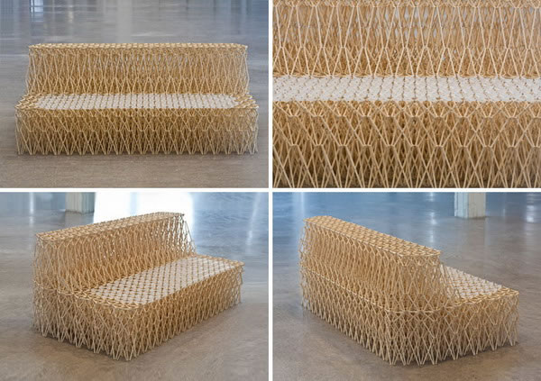 “沙發(fā)_xxxx”是德國設(shè)計師yuya ushida設(shè)計的可自由伸縮的家具,它可以在椅子和沙發(fā)之間轉(zhuǎn)換使用。這件作品在2011年科隆國際家具展的designers fair中展出。這個沙發(fā)是由8000雙筷子制成的,每一根筷子都被切成了長度不同的4段,它們還被打磨出特定的角度,以便相互鉸接組合成整件家具。小鐵環(huán)和連接件則用于連接各部分組件,并使沙發(fā)可以靈活伸縮、活動。這件作品共耗時3個月完成。沙發(fā)_xxxx也非常實用,同時坐三個70公斤的人是沒有問題的。