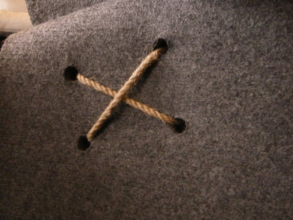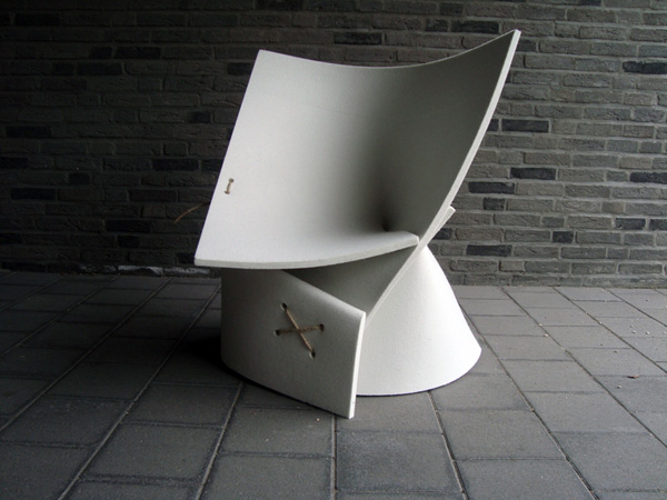 當(dāng)你買回一張新地氈的時(shí)候你多半的做法會(huì)是把舊的扔掉,為什么不把它循環(huán)利用呢?如此柔軟的坐墊做成椅子一定很舒服的。把毛氈變成椅子也許你會(huì)覺得不可思議,但實(shí)驗(yàn)證明是可以的,只要一張正方形的氈,切幾條縫,打幾個(gè)孔,折疊,用麻繩鎖緊就能變成一張承受力特強(qiáng)的氈椅,扭曲的角度是依靠力學(xué)原理設(shè)計(jì)的。這個(gè)設(shè)計(jì)讓我們看到可持續(xù)生態(tài)的利用以及力學(xué)的優(yōu)美!