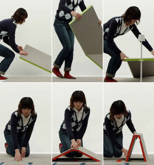 Land Peel 是由日本設計系學生 Shin Yamashita 設計的一款多功能的地墊,它們的功能就體現(xiàn)在折疊上了,對地墊進行全方位的切割,當它鋪平之時就是個普通的地墊,當我們開始折起它們的時候,就變成了一個辦公桌、一個茶幾、一個靠背椅等等。