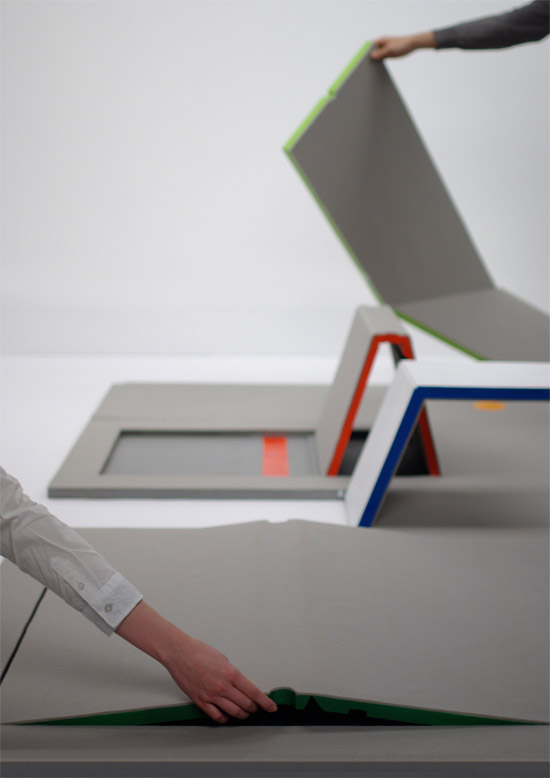 Land Peel 是由日本設(shè)計(jì)系學(xué)生 Shin Yamashita 設(shè)計(jì)的一款多功能的地墊,它們的功能就體現(xiàn)在折疊上了,對(duì)地墊進(jìn)行全方位的切割,當(dāng)它鋪平之時(shí)就是個(gè)普通的地墊,當(dāng)我們開始折起它們的時(shí)候,就變成了一個(gè)辦公桌、一個(gè)茶幾、一個(gè)靠背椅等等。很好的設(shè)計(jì),為我們提供了一個(gè)創(chuàng)意的休閑空間,相信會(huì)受很多人稀飯吧。