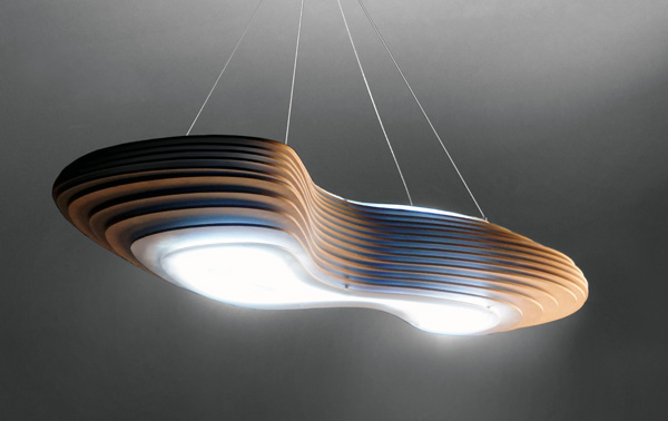 現(xiàn)代的燈具已不再是單純的照明工具,它被設(shè)計(jì)師賦予各種各樣的象征,每一次大膽的嘗試都是一個(gè)創(chuàng)新。下面這組看似像懸浮物的LED燈具是由Integral Studio 團(tuán)隊(duì)的Vinaccia設(shè)計(jì)的,據(jù)設(shè)計(jì)師介紹這款炫彩的吊燈象征著漂浮的彩云,硬質(zhì)木條層層疊加的方式就像是一層層浮云。柔和光線環(huán)繞層層框架穿過(guò)木縫給人一種錯(cuò)綜復(fù)雜的感覺(jué)。