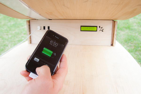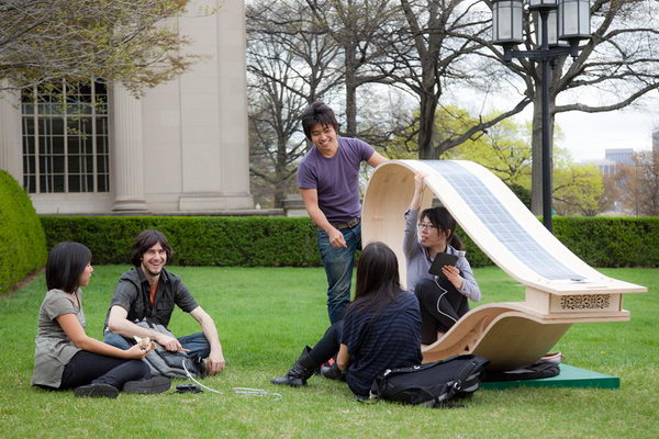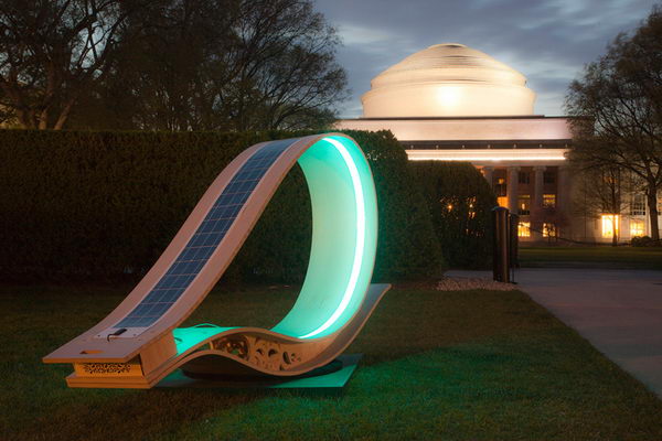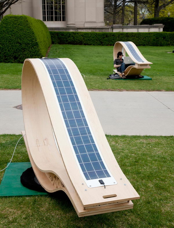 這是麻省理工學(xué)院希拉肯尼迪教授帶領(lǐng)建筑系學(xué)生開(kāi)發(fā)的一款太陽(yáng)能躺椅:SOFT Rockers。它的主體是一個(gè)木質(zhì)的搖椅,頂端則配備了太陽(yáng)能電池板,根據(jù)太陽(yáng)光強(qiáng)烈的角度,利用底部的互動(dòng)式轉(zhuǎn)軸自動(dòng)選擇調(diào)整,從而讓讓椅子上的太陽(yáng)板盡可能多的吸收陽(yáng)光,這些太陽(yáng)能轉(zhuǎn)化為電能儲(chǔ)存后,可為電子產(chǎn)品充電,夜間也能照明。