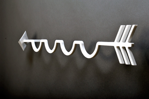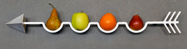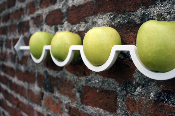 設(shè)計(jì)師Andrea Maffezzoni & Nicola Loi 在墻上安裝了一種水果架,由可麗耐和鋁材質(zhì)構(gòu)成。它的外形酷似箭,只不過箭的中間部分向下連續(xù)彎曲形成多個半圓狀,而這些半圓狀則巧妙地用來擱置水果。造型不僅獨(dú)特,也能起到不錯的裝飾效果。