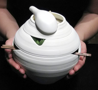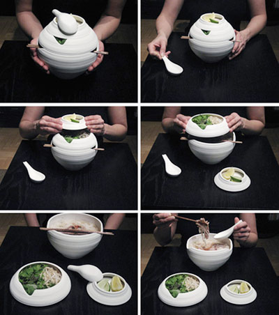 這一套碗筷的設計靈感來自越南彩燈的形狀,將豐富和簡化你的飲食,讓您能充分的體驗著名的越南小吃和湯。此碗一共分為三層,分別可用來裝調味品、菜和主食,在每一層碗的碗沿上都有兩個對稱的凹槽,你將能夠很容易的將筷子、勺子、放在凹槽處,不用擔心他們會滑落。在小小的細節(jié)上面的改變,就能解決了我們生活中遇到的一些問題。