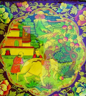 藏式家具的繪畫顏料分礦物質(zhì)與植物兩種。礦物質(zhì)原料經(jīng)采集后,需經(jīng)過研磨或鑿舂,又經(jīng)水內(nèi)沉淀,過濾,曬干為各色粉末顏料,使用時調(diào)以膠、水等。植物顏料有連黃等,都是草本植物在沸水中煎煮后,提煉而成;土紅色顏料則是一種樹皮在水中浸泡、搓揉、沉淀后制成。近年來,家具在制作時,較多地使用了內(nèi)地的水粉顏料。金色顏料藏族同胞偏愛從印度進(jìn)口的金粉,寺廟和貴族家具中也有直接用真金粉裝飾家具、鑲嵌寶石的,顯得滿室生輝、豪華至極。