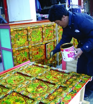 據(jù)北京東路某藏式家具店老板介紹,其實,現(xiàn)代藏式家具的彩繪技藝是最能體現(xiàn)兼收并蓄特點的,也是最能體現(xiàn)漢藏團(tuán)結(jié)的:從圖案上看,傳統(tǒng)藏式家具的圖案多是宗教題材,現(xiàn)在,圖案融入了不少山水、花鳥等內(nèi)地人民喜好的圖案,甚至,還有反映現(xiàn)實生活題材的,比如青藏鐵路建設(shè)的圖案也開始出現(xiàn)在個別藏式家具中。