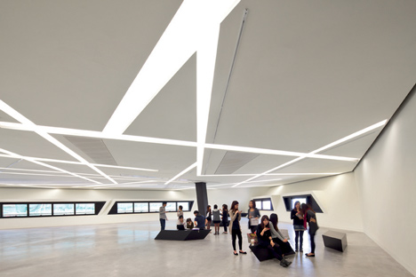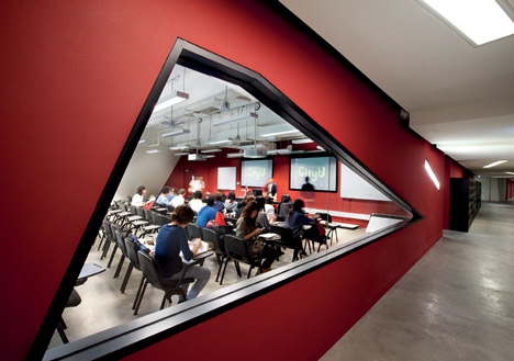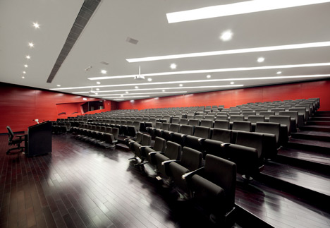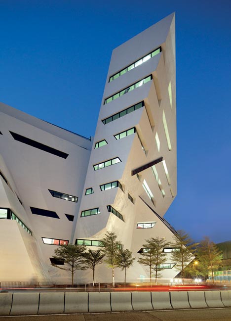 這是由美國(guó)建筑師丹尼爾?里伯斯金完成的一個(gè)位于香港城市大學(xué)的媒體中心,它包括實(shí)驗(yàn)室,劇院和為學(xué)校電腦工程和媒體技術(shù)系準(zhǔn)備的教室。與里伯斯金別的設(shè)計(jì)相似,建筑中心不同平面的體量向上聚集,形成頂部的尖頂。光滑的玻璃部分包圍建筑的外墻,同時(shí)它還形成室內(nèi)天花板上的透明光條。媒體中心預(yù)計(jì)在2011年十月份正式開(kāi)放。