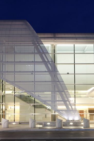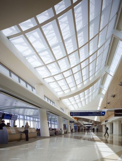 B航站樓是圣何塞一個具有挑戰(zhàn)性機(jī)場改造。它是建立在受現(xiàn)有公路和水路限制的狹窄部位,機(jī)場在改造時仍然運(yùn)作。Fentre建筑師事務(wù)所不僅設(shè)計了一種有趣的形式,同時還能滿足具有挑戰(zhàn)性的加州地震的標(biāo)準(zhǔn),皮膚有肋的彎曲或 穿孔金屬板覆蓋的終端外觀。金屬結(jié)構(gòu)環(huán)繞,擁抱和保護(hù)玻璃管。Fentre赫然連接這個流暢的外觀設(shè)計和屋頂。